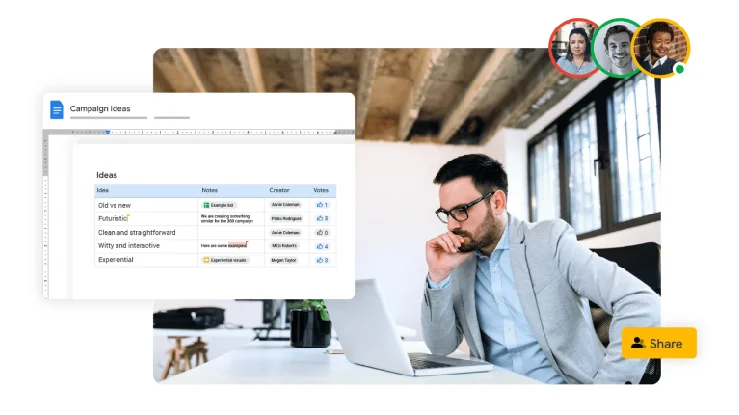Craft business documents seamlessly using Docs, Sheets, and Slides.